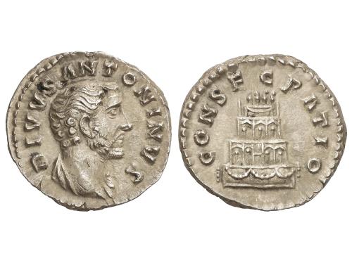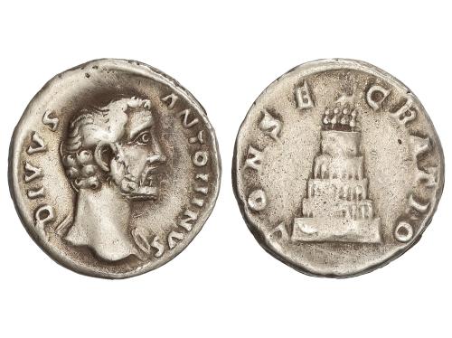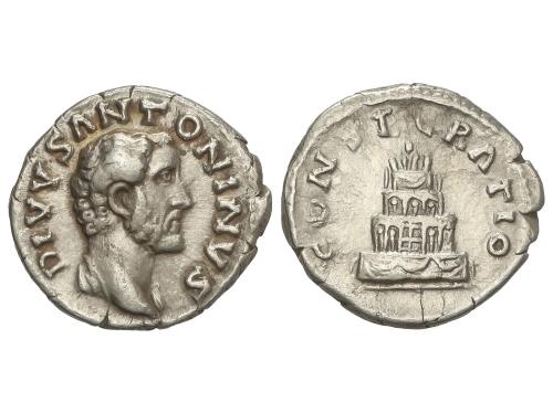 IMPERIO ROMANO. Denario. 161-180 d.C. ANTONINO PÍO. Anv.: DIVVS ANTONINVS. Cabeza descubierta de Antonino a derecha. Rev.: CONSECRATIO. Pira funeraria rematada por Antonino en cuadriga. 3,08 grs. AR. C-164; RIC-M436; BMC-M57. MBC+.