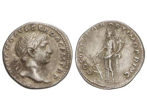 IMPERIO ROMANO. Denario. 113-114 d.C. TRAJANO. Anv.: IMP. TRAIANO AVG GER. DAC. P. M. TR. P. COS VI P. P. Cabeza laureada a derecha . Rev.: S. P. Q. R. OPTIMO PRINCIPI. Felicitas sosteniendo caduceo y cornucopia. 3,17 grs. AR. C-404a; RIC-272. MBC+.