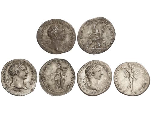 IMPERIO ROMANO. Lote 3 monedas Denario. TRAJANO. AR. COS. V. P. P. S. P. Q. R. OPTIMO PRINC. Equidad a izquierda con balanza y cornucopia C-85, P. M. TR. P. COS. VI P. P. S. P. Q. R. Marte en marcha a derecha con lanza y trofeo C-270 y DAC. CAP. COS. V. P. P. S. P. Q. R. OPTIMO PRINC. Captivo dacio sentado sobre pila de armas a izquierda C-120a. MBC.
