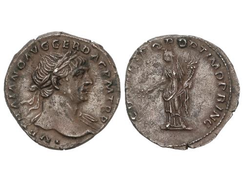 IMPERIO ROMANO. Denario. 113-114 d.C. TRAJANO. Anv.: IMP. TRAIANO AVG GER. DAC. P. M. TR. P. COS VI P. P. Cabeza laureada a derecha . Rev.: S. P. Q. R. OPTIMO PRINCIPI. Felicitas sosteniendo caduceo y cornucopia. 3,17 grs. AR. C-404a; RIC-272. MBC+.