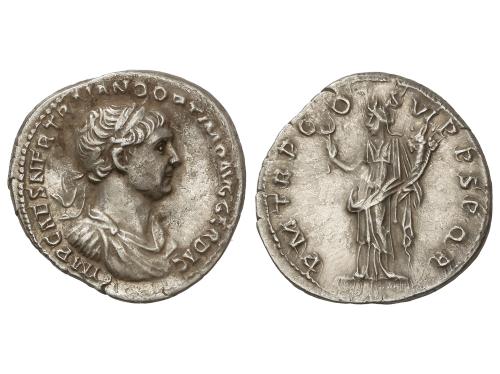 IMPERIO ROMANO. Denario. 113-114 d.C. TRAJANO. Anv.: IMP. TRAIANO AVG GER. DAC. P. M. TR. P. COS VI P. P. Cabeza laureada a derecha . Rev.: S. P. Q. R. OPTIMO PRINCIPI. Felicitas sosteniendo caduceo y cornucopia. 3,17 grs. AR. C-404a; RIC-272. MBC+.
