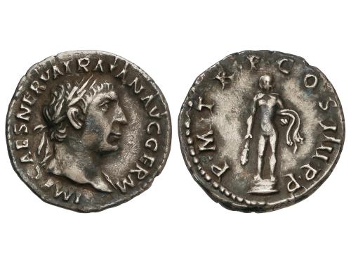 IMPERIO ROMANO. Denario. 103-112 d.C. TRAJANO. Anv.: IMP. TRAIANO AVG. GER. DAC. P. M. TR. P. Cabeza laureada a derecha. Rev.: COS. V. P. P. S. P. Q. R. OPTIMO PRINC. Felicidad en pie a izquierda con caduceo y cornucopia. 3,42 grs. AR. Pátina. C-81a. MBC+.