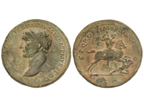 IMPERIO ROMANO. Sestercio. 103-111 d.C. TRAJANO. Anv.: IMP. CAES. NERVAE TRAIANO AVG. GER. DAC. P. M. TR. P. COS. V P. P. Busto laureado a izquierdo. Rev.: S. P. Q. R. OPTIMO PRINCIPI S. C. Trajano, galopando a derecha, portando lanza y derribando a un enemigo. 24,12 grs. AE. C-535 var. MBC.