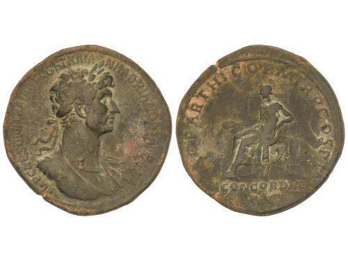 IMPERIO ROMANO. Sestercio. 117-138 d.C. ADRIANO. Anv.: IMP. CAES. DIVI. TRAIAN AVG. F. TRAIAN HADRIAN OPT. AVG. GER. Busto laureado a derecha. Rev.: DAC. PARTHICO P. M. TR. P. COS P. P. / CONCORDIA / S C. Concordia sentada a izquierda. 25,77 grs. AE. (Oxidaciones). RIC-360. MBC.