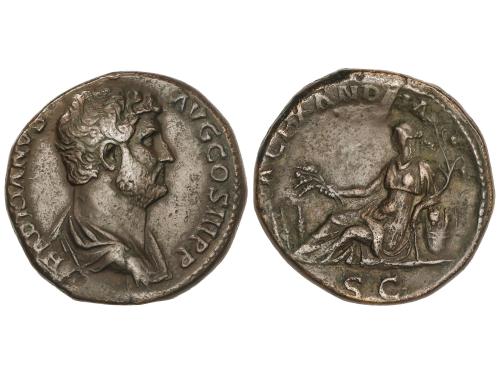 IMPERIO ROMANO. Sestercio. 134-138 d.C. ADRIANO. Anv.: HADRIANVS AVG. COS. III. P. P. Busto laureado a derecha. Rev.: ALEXANDRIA S. C. Alejandría reclinada a izquierda, cortando tres espigas y rama de vid, con el brazo apoyado en un cesto lleno de racimos de uva, ante ella espigas. 25,77 grs. AE. Pátina oscura. C-157; RIC-843. MBC/MBC-.