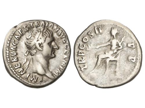 IMPERIO ROMANO. Denario. 114-117 d.C. TRAJANO. Anv.: IMP. CAES. NER. TRAIAN. OPTIM. AVG. GER. DAC. PARTHICO. Busto laureado y drapeado de Trajano a derecha. Rev.: P. M. TR. P. COS. VI P. P. S.P.Q.R. La Valentía con casco en pie, portando lanza y parazonio, posando el pie sobre un casco. 3,29 grs. AR. C-272a; RIC-339; BMC-601. MBC.