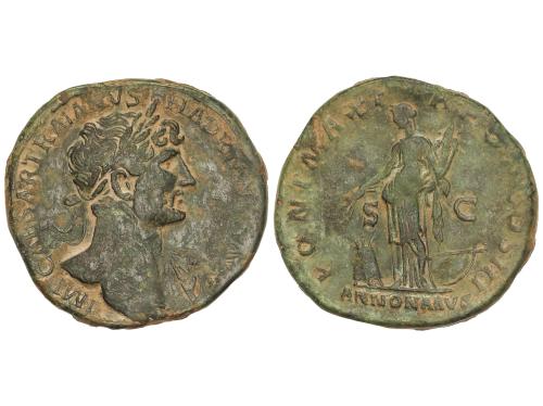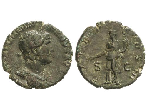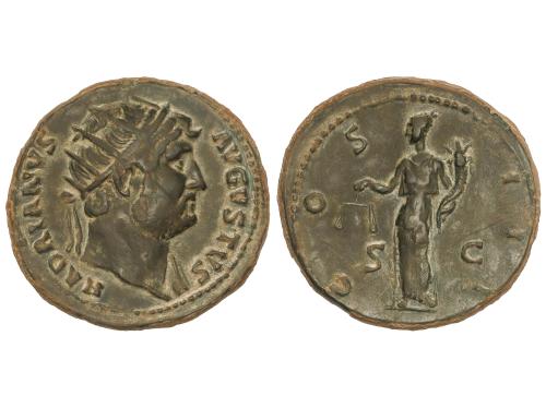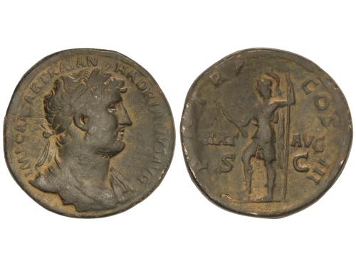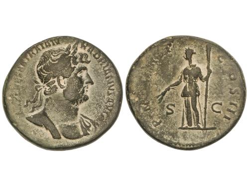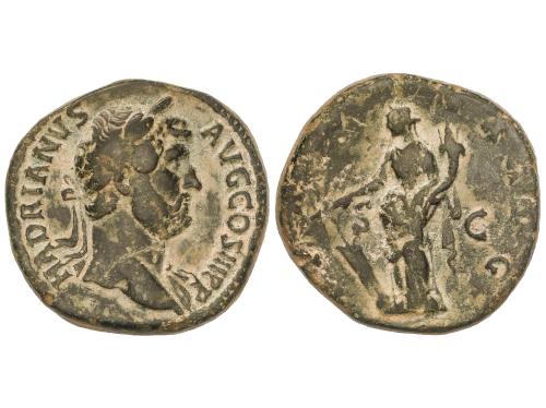 IMPERIO ROMANO. Sestercio. 121-123 d.C. ADRIANO. Anv.: IMP. CAESAR TRAIAN. HADRIANVS AVG. Busto laureado a derecha. Rev.: P. M. TR. P. COS. III S. C. Ceres a izquierda, sosteniendo dos espigas y antorcha. 25,90 grs. AE. Pátina. C-1075; RIC-662. MBC.
