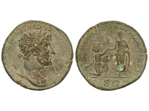 IMPERIO ROMANO. Sestercio. 119-121 d.C. ADRIANO. Anv.: IMP. CAESAR TRAIANVS HADRIANVS AVG. P. M. TR. P. COS. III. Busto laureado a derecha. Rev.: RESTITVTORI ORBIS TERRARVM S. C. Adriano en pie a izquierda alzando a una mujer. 25,54 grs. AE. (Oxidaciones). Pátina verde. C-1285. MBC-.