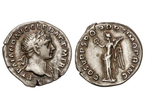 IMPERIO ROMANO. Denario. 103-112 d.C. TRAJANO. Anv.: IMP. TRAIANO AVG. GER. DAC. P. M. TR. P. Cabeza laureada a derecha. Rev.: COS. V. P. P. S. P. Q. R. OPTIMO PRINC. Felicidad en pie a izquierda con caduceo y cornucopia. 3,42 grs. AR. Pátina. C-81a. MBC+.