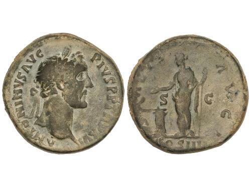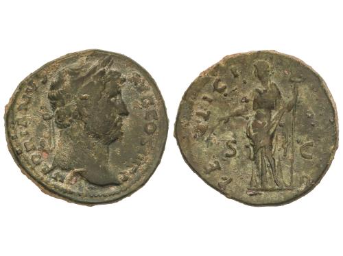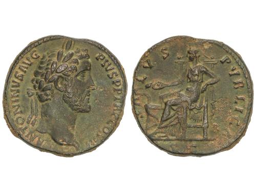 IMPERIO ROMANO. Sestercio. 141-143 d.C. ANTONINO PÍO. Anv.: ANTONINVS AVG PIVS P P TR P COS III. Cabeza laureada a derecha. Rev.: SALVS PVBLICA. Salus sentada a izquierda con patera sobre altar con serpiente, en exergo: SC. 23,66 grs. AE. (Leves oxidaciones). Pátina. C-739. MBC.