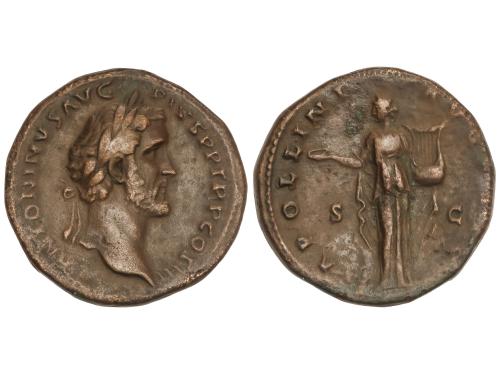 IMPERIO ROMANO. Sestercio. 140-144 d.C. ANTONINO PÍO. Anv.: ANTONINVS AVG. PIVS P. P. TR. P. COS. III. Cabeza laureada a derecha. Rev.: APOLLINI (AVGVSTO) S. C. Apolo en pie a izquierda con lira y pátera. 22,82 grs. AE. C-62. MBC-.