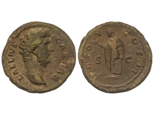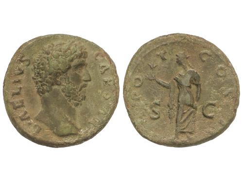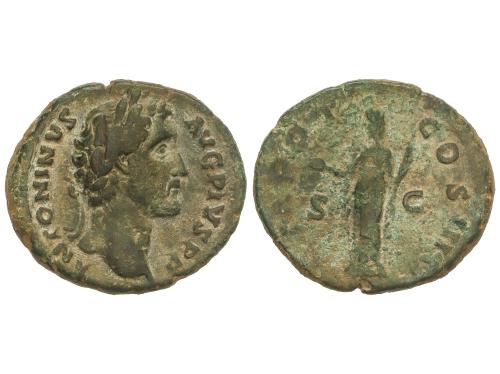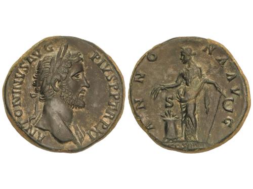 IMPERIO ROMANO. Sestercio. 147-148 d.C. ANTONINO PÍO. Anv.: ANTONINVS AVG. PIVS P. P. TR. P. XI. Busto laureado a derecha. Rev.: ANNONA AVG. En exergo: COS. IIII S. C. Abundancia en pie a izquierda con dos espigas y ancla, a sus pies modio. 21,16 grs. AE. (Algo limpiada). C-39. MBC.