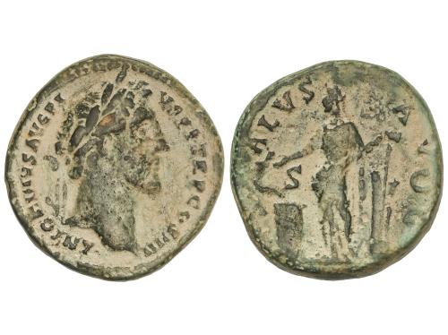 IMPERIO ROMANO. Sestercio. 144 d.C. ANTONINO PÍO. Anv.: ANTONINVS AVG. PIVS PP. TR. P. COS. III. Busto a derecha. Rev.: SALVS AVG S. C. Salus estante oficiando en altar. 25,44 grs. AE. (Limpiada). Pátina. RIC-635. MBC-.