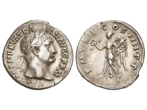 IMPERIO ROMANO. Denario. 114-117 d.C. TRAJANO. Anv.: IMP. CAES. NER. TRAIAN. OPTIM. AVG. GER. DAC. PARTHICO. Busto laureado y drapeado de Trajano a derecha. Rev.: P. M. TR. P. COS. VI P. P. S.P.Q.R. La Valentía con casco en pie, portando lanza y parazonio, posando el pie sobre un casco. 3,29 grs. AR. C-272a; RIC-339; BMC-601. MBC.