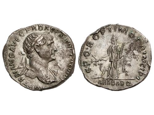 IMPERIO ROMANO. Denario. 113-114 d.C. TRAJANO. Anv.: IMP. TRAIANO AVG GER. DAC. P. M. TR. P. COS VI P. P. Cabeza laureada a derecha . Rev.: S. P. Q. R. OPTIMO PRINCIPI. Felicitas sosteniendo caduceo y cornucopia. 3,17 grs. AR. C-404a; RIC-272. MBC+.