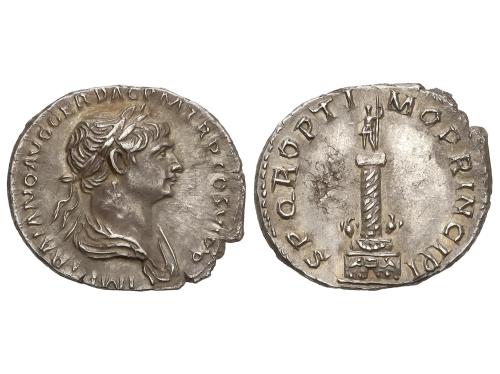 IMPERIO ROMANO. Denario. 113-114 d.C. TRAJANO. Anv.: IMP. TRAIANO AVG. GER. DAC. P. M. TR. P. COS VI P. P. Busto laureado a derecha. Rev.: S.P. Q. R.OPTIMO PRINCIPI. Columna Trajana, encima estatua del emperador. 3,20 grs. AR. C-558; RIC-292. MBC+.