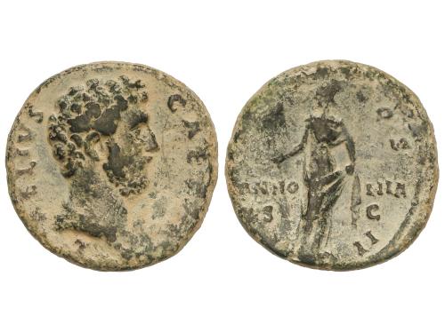 IMPERIO ROMANO. As. 137 d.C. AELIO. Anv.: L. AELIVS CAESAR. Busto descubierto a derecha. Rev.: PANNONIA TR. POT. COS. II. S. C. Pannonia en pie a izquierda con estandarte. 11,95 grs. AE. Pátina verde. C-25. MBC-.