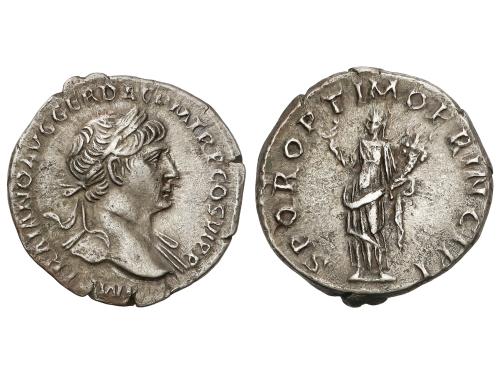 IMPERIO ROMANO. Denario. 103-112 d.C. TRAJANO. Anv.: IMP. TRAIANO AVG. GER. DAC. P. M. TR. P. Cabeza laureada a derecha. Rev.: COS. V. P. P. S. P. Q. R. OPTIMO PRINC. Felicidad en pie a izquierda con caduceo y cornucopia. 3,42 grs. AR. Pátina. C-81a. MBC+.