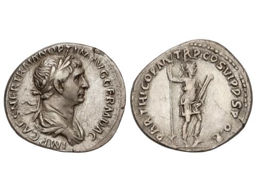 IMPERIO ROMANO. Denario. 114-117 d.C. TRAJANO. Anv.: IMP. CAES. NER. TRAIAN. OPTIM. AVG. GER. DAC. PARTHICO. Busto laureado y drapeado de Trajano a derecha. Rev.: P. M. TR. P. COS. VI P. P. S.P.Q.R. La Valentía con casco en pie, portando lanza y parazonio, posando el pie sobre un casco. 3,29 grs. AR. C-272a; RIC-339; BMC-601. MBC.
