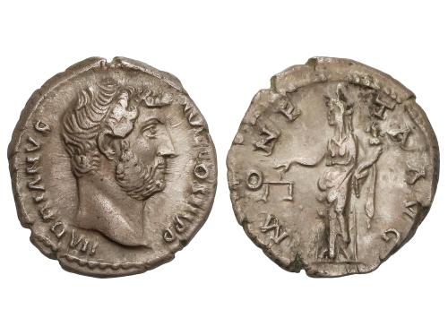 IMPERIO ROMANO. Denario. 134-138 d.C. ADRIANO. Anv.: HADRIANVS AVG. COS III P. P. Busto drapeado de Adriano a derecha. Rev.: MONETA AVG. Moneta de pie a izquierda con balanza y cornucopia. 3,54 grs. AR. C-965; RIC-256; BMC-976. MBC+.
