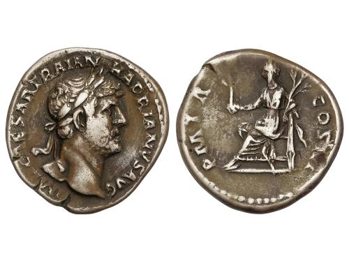 IMPERIO ROMANO. Denario. 117-138 d.C. ADRIANO. Anv.: IMP. CAESAR TRAIAN. HADRIANVS AVG. Busto laureado a derecha. Rev.: P. M. TR. P. COS. III. Roma sentada a izquierda sobre una coraza, el pie sobre un yelmo, sosteniendo Victoria y lanza. 3,01 grs. AR. Pátina. C-1103; RIC-77. MBC.