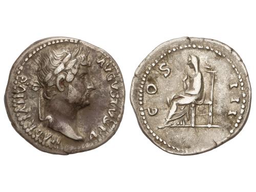 IMPERIO ROMANO. Denario. 128 d.C. ADRIANO. Anv.: HADRIANVS AVGVSTVS. Cabeza laureada a derecha. Rev.: COS III. Pudicitia velada sentada a izquierda en un trono. 3,19 grs. AR. Pátina. C-393; RIC-178. MBC.