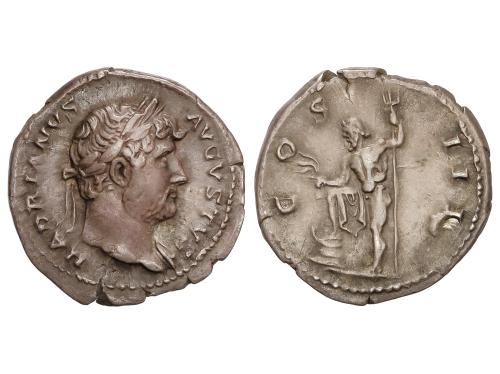 IMPERIO ROMANO. Denario. 125-128d.C. ADRIANO. Anv.: HADRIANVS AVGVSTVS. Cabeza laureada a derecha. Rev.: COS III. Neptuno de pie con tridente y acrostolium con el pie derecho sobre Proa. 3,31 grs. AR. Pátina. C-309; RIC-788; BMC-354. MBC+.