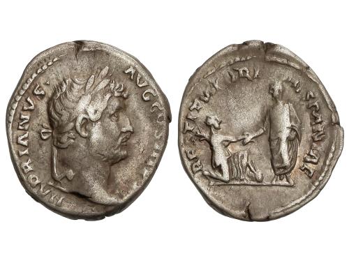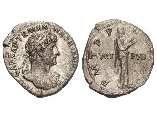 IMPERIO ROMANO. Denario. 117-138 d.C. ADRIANO. Anv.: IMP. CAESAR. TRAIAN. HADRIANVS. AVG. Busto laureado a derecha. Rev.: VOT. PVB. P. M. TR. P. (COS. III). Piedad con velo en pie a derecha. 3,23 grs. AR. C-1477; RIC-141; BMC-324. MBC+.