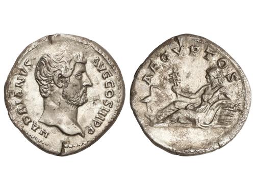 IMPERIO ROMANO. Denario. 134-138 d.C. ADRIANO. Anv.: HADRIANVS AVG. COS III P. P. Cabeza descubierta de Adriano a derecha. Rev.: AEGYPTOS. Egipto reclinado a izquierda con sistro (instrumento musical egipcio), a sus pies Ibis. 3,07 grs. AR. (Pequeñas oxidaciones en reverso). C-99; RIC-297; BMC-797. MBC+.