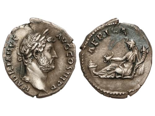 IMPERIO ROMANO. Denario. 134-138 d.C. ADRIANO. Anv.: HADRIANVS AVG. COS III P. P. Cabeza drapeada de Adriano a derecha. Rev.: AFRICA. África recostada a izquierda con cornucopia y escorpión, a sus pies cesta de fruta. 3,02 grs. AR. (Oxidaciones limpiadas). C-141a; RIC-299; BMC-814. MBC+.