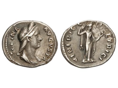 IMPERIO ROMANO. Denario. 128-137 d.C. SABINA. Anv.: SABINA AVGVSTA. Busto diademado y drapeado de Sabina a derecha. Rev.: VENERI GENETRICI. Venus en pie a derecha con una manzana. 2,92 grs. AR. C-73; RIC-396; BMC-944. MBC+.