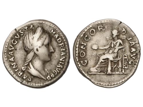 IMPERIO ROMANO. Denario. 128-137 d.C. SABINA. Anv.: SABINA AVGVSTA HADRIANI AVG. P. P. Busto diademado y drapeado de Sabina a derecha. Rev.: CONCORDIA AVG. Concordia sentada a izquierda con pátera y cetro. 3,41 grs. AR. C-12; RIC-398; BMC-895. MBC.