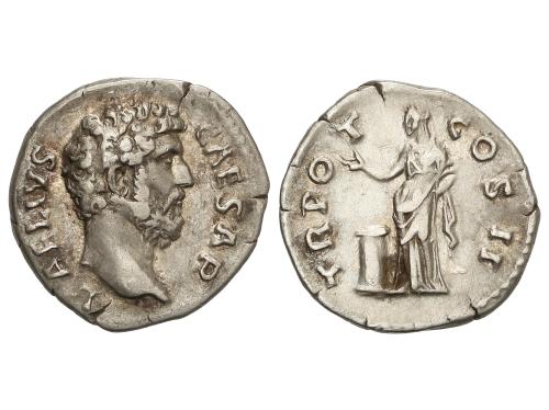 IMPERIO ROMANO. Denario. 137 d.C. AELIO. Anv.: L. AELIVS CAESAR. Cabeza de Aelio a derecha. Rev.: TR. POT. COS. II. Piedad de pie a izquierda colocando incienso sobre altar. 3,01 grs. AR. C-53a; RIC-432; BMC-975. MBC.