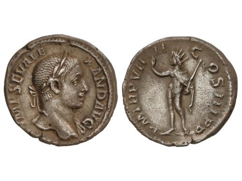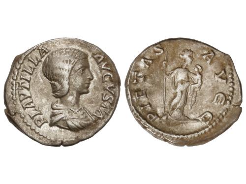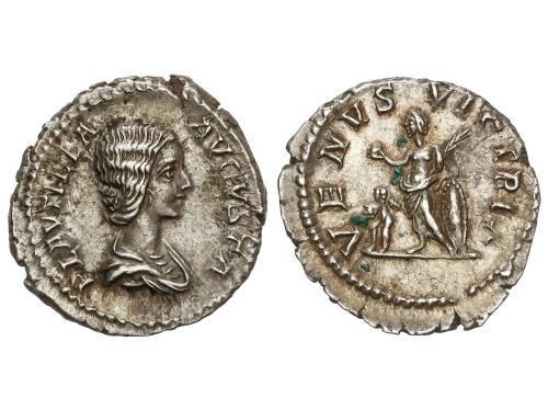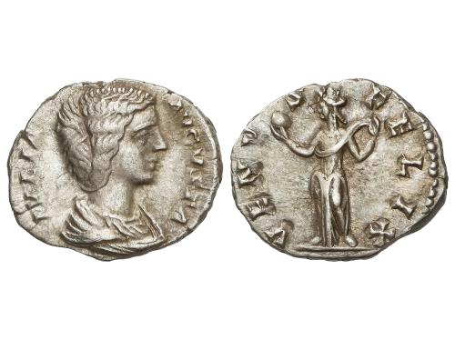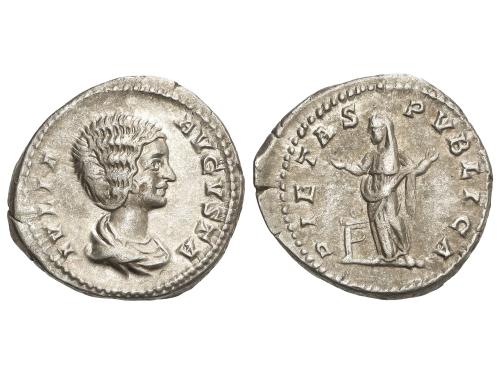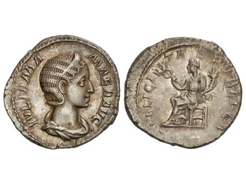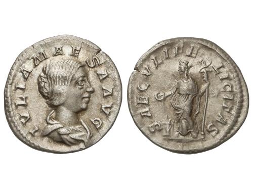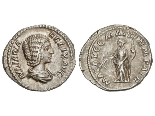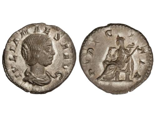 IMPERIO ROMANO. Denario. 235 d.C. JULIA MAMAEA. Anv.: IVLIA MAMAEA AVG. Busto diademado a derecha. Rev.: FELICITAS PVBLICA. Felicidad sentada a izquierda sosteniendo caduceo y cornucopia. 2,91 grs. C-24; RIC-338 (Alejandro Severo); BMC-658 (Alejandro Severo). EBC-/MBC+.