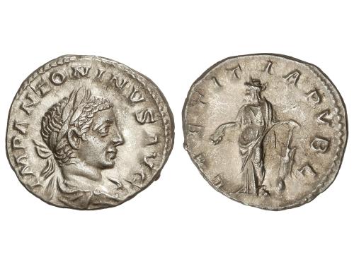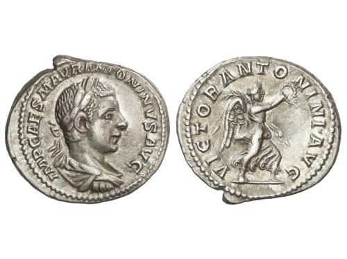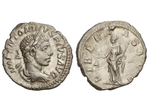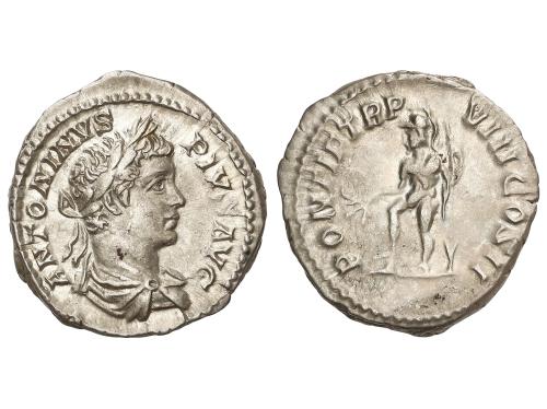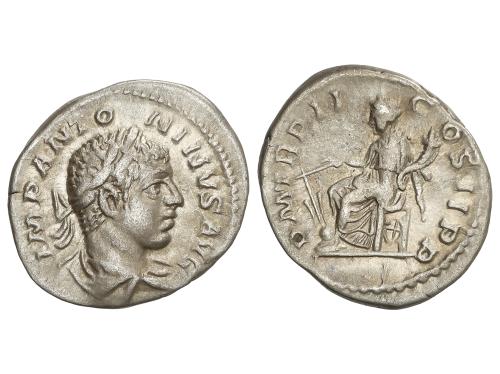 IMPERIO ROMANO. Denario. 219 d.C. HELIOGÁBALO. Anv.: IMP ANTONINVS AVG. Busto laureado a derecha. Rev.: P M TR P II COS II P P. Fortuna sentada sosteniendo timón colocado sobre un globo terráqueo con su mano derecha y una cornucopia en la izquierda; debajo del asiento, una rueda. 2,63 grs. C-149; RIC-19. MBC.