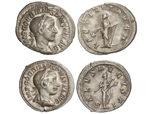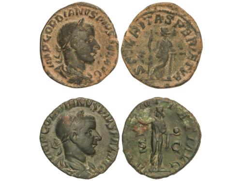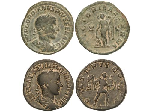IMPERIO ROMANO. Lote 2 monedas Sestercio. 241-244 d.C. GORDIANO III. Rev.: IMP. CAES. M. ANT. GORDIANVS AVG. Gordianp con lanza y escudo a derecha. VICTORIA AETERNA. Victoria en pie a izquierda, delante autivo. 19,36 y 21,50 grs. A EXAMINAR. RIC-266 y RIC-338. MBC/MBC-.