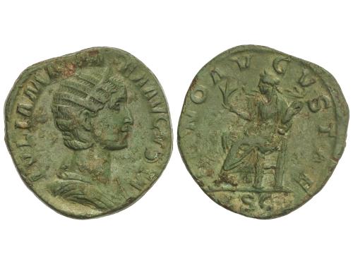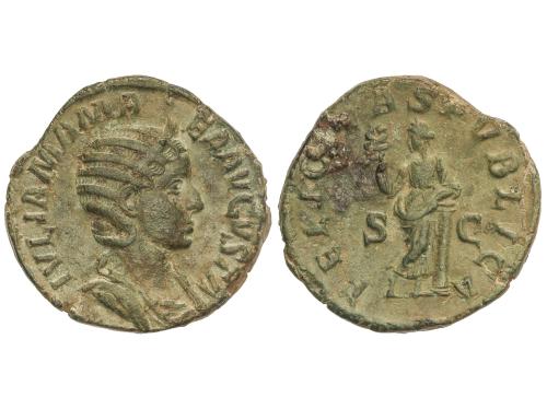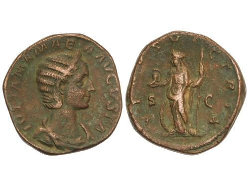 IMPERIO ROMANO. Sestercio. 235 d.C. JULIA MAMAEA. Anv.: IVLIA MAMAEA AVGVSTA. Busto diademado a derecha. Rev.: FELICITAS PVBLICA S. C. Felicidad en pie a izquierda con caduceo y reposando en una columna. 21,69 grs. (Algo realzada). Pátina verde. C-21; RIC-676; BMC-487. MBC/MBC-.