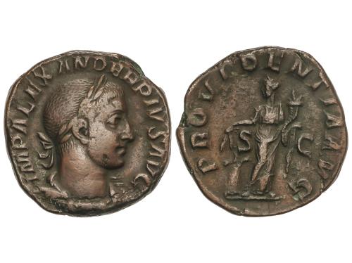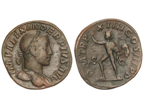 IMPERIO ROMANO. Sestercio. 222-235 d.C. ALEJANDRO SEVERO. Anv.: IMP. SEV. ALEXANDER AVG. Busto laureado a derecha. Rev.: ANNONA AVGVSTI S. C. Annona en pie a izquierda sosteniendo ancla y modio. 12,37 grs. (Oxidaciones, algo limpiada). Pátina verde. RIC-549. MBC+/MBC.
