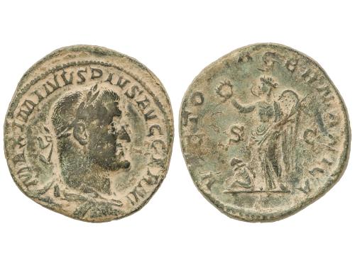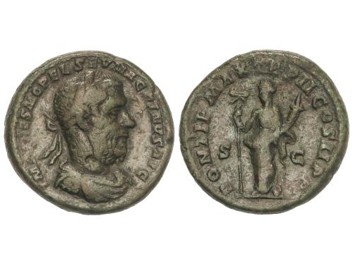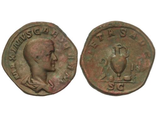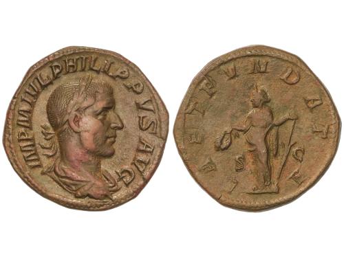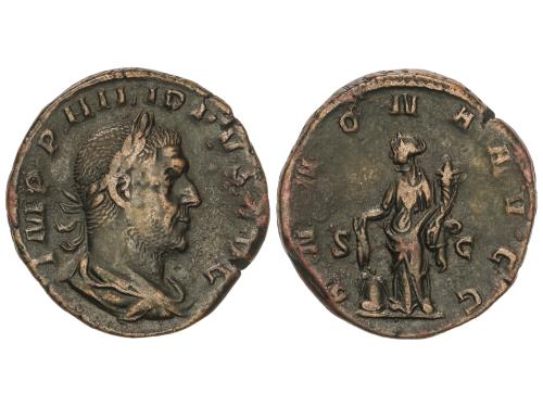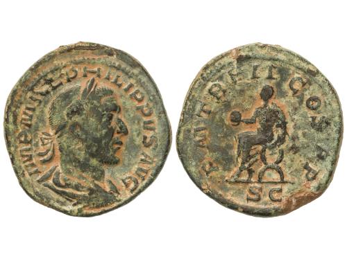 IMPERIO ROMANO. Sestercio. 245 d.C. FILIPO I. Anv.: IMP. M. IVL. PHILIPPVS AVG. Busto laureado y drapeado a derecha. Rev.: P. M. TR. P. II. COS. P. P. S. C. Filipo sedente a izquierda sobre silla curul. 20,28 grs. Pátina verde. C-121; RIC-148a. MBC.
