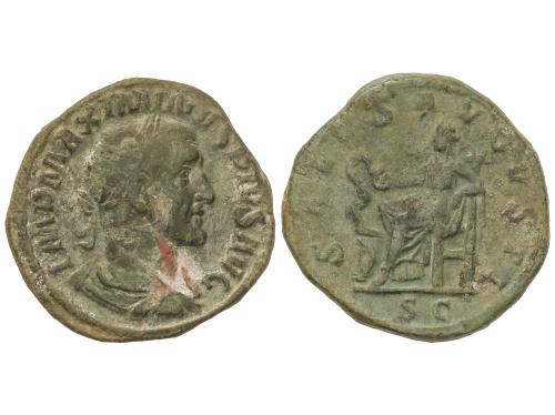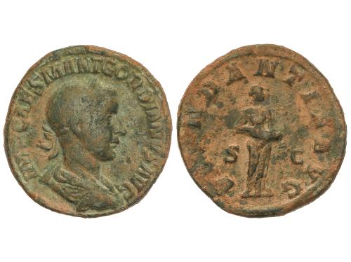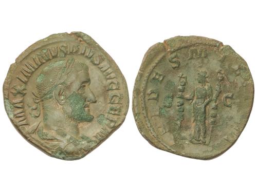 IMPERIO ROMANO. Sestercio. 235 d.C. JULIA MAMAEA. Anv.: IVLIA MAMAEA AVGVSTA. Busto diademado a derecha. Rev.: FELICITAS PVBLICA S. C. Felicidad en pie a izquierda con caduceo y reposando en una columna. 19,09 grs. (Oxidaciones). Pátina verde. C-21; RIC-676; BMC-487. MBC.