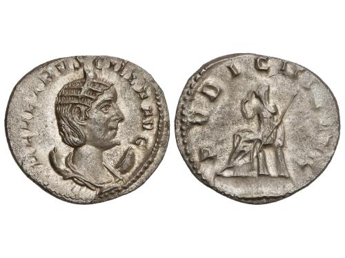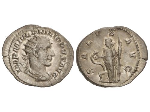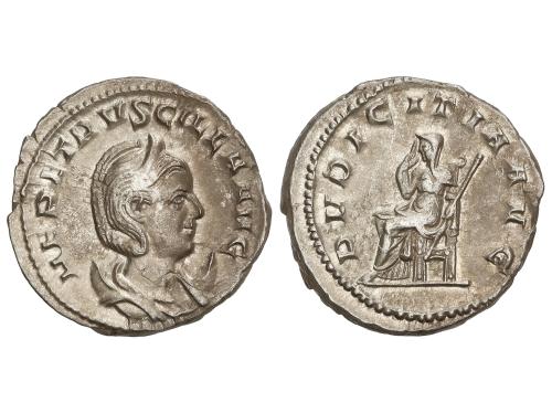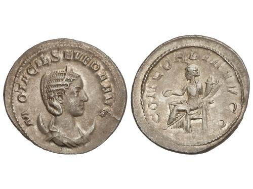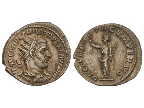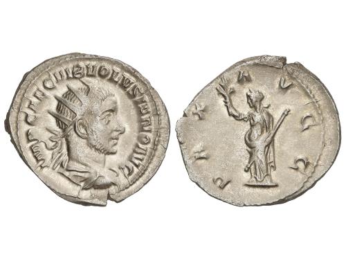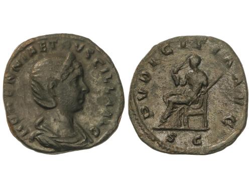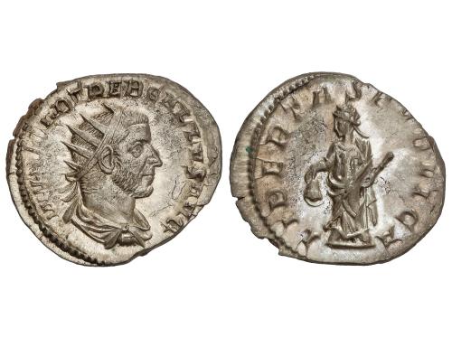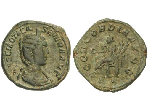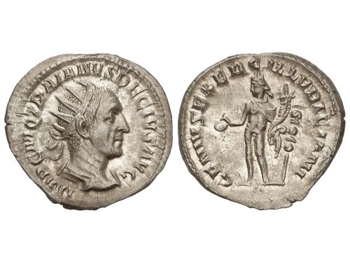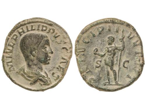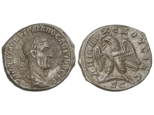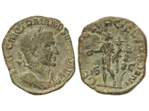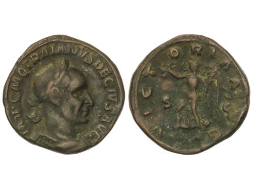 IMPERIO ROMANO. Sestercio. 249-251 d.C. TRAJANO DECIO. Anv.: IMP. C. M. Q. TRAIANVS DE(CI)VS AVG. Busto laureado, con coraza a derecha. Rev.: GE(NIVS) EXERC. ILLVRICIANI SC. Genio en pie a izquierda, sosteniendo pátera y cornucopia, detrás estandarte. 14,97 grs. Pátina. C-53; RIC-117b. (MBC).